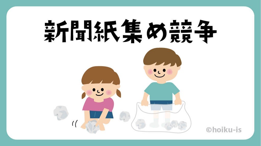 こちらのページで紹介した「新聞紙集め競争」の遊び方解説イラストを、保育施設での説明にご利用いただけるよう、ダウンロード素材をご用意しました。ほいくisメンバーに登録(無料)すれば、無料でダウンロードすることができます。