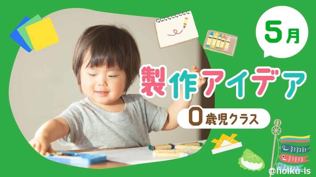 5月は、ゴールデンウィーク、子どもの日、ファミリーデーとイベントが続き、製作モチーフには困らない月です。しかし、0歳児は月齢での発達差も大きいため、で崩れた生活リズムを取り戻すまでは、なかなかゆったりと過ごせずバタバタと慌ただしく感じるかもしれません。ゴールデンウィーク以降、暖かく過ごしやすいですが、日によっては汗ばむような日もあるかもしれません。0歳児は体温が高めなので、他の年齢よりも気温で体感温度が左右されます。その日の気温や天候に応じて、帽子や日よけなど紫外線対策や水分補給などをしながら子どもたちに負担のないように過ごしたいですね。