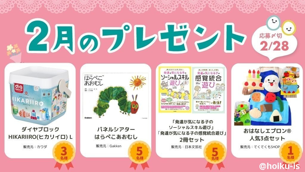 毎月恒例の「ほいくisメンバー」限定特別企画! 保育者の皆さんへ感謝の気持ちを込めて、ダイヤブロック HIKARIIRO(ヒカリイロ)L、パネルシアター はらぺこあおむし、「発達が気になるこのソーシャルスキル遊び」「発達が気になる子の感覚統合遊び」2冊セット、おはなしエプロン®人気3点セットを抽選でプレゼントします。