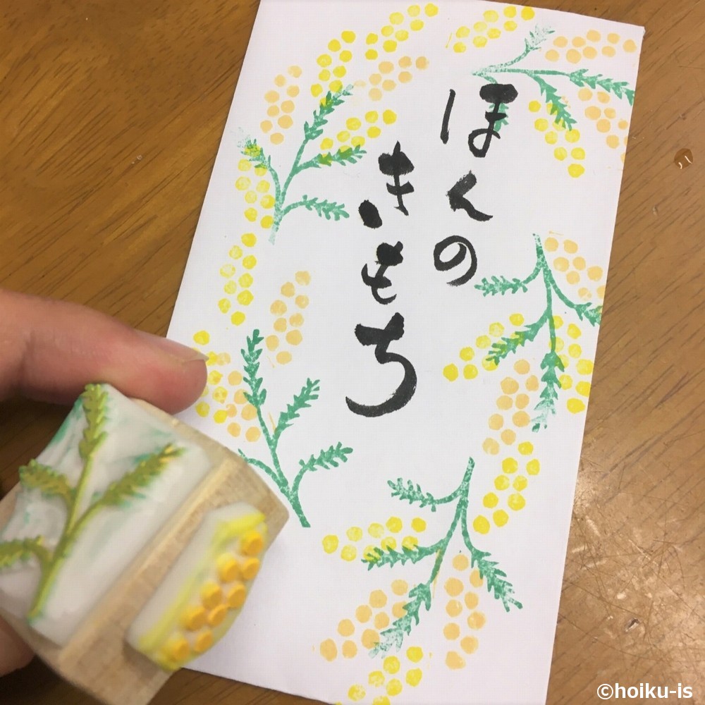 ミモザの花は、丸い小さな玉が集まっているだけ。なのに、たくさん押すとそれっぽくなるのが面白いですよね。