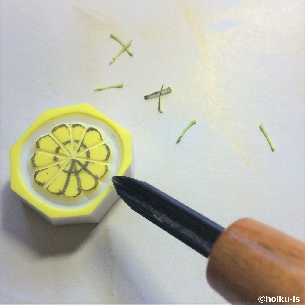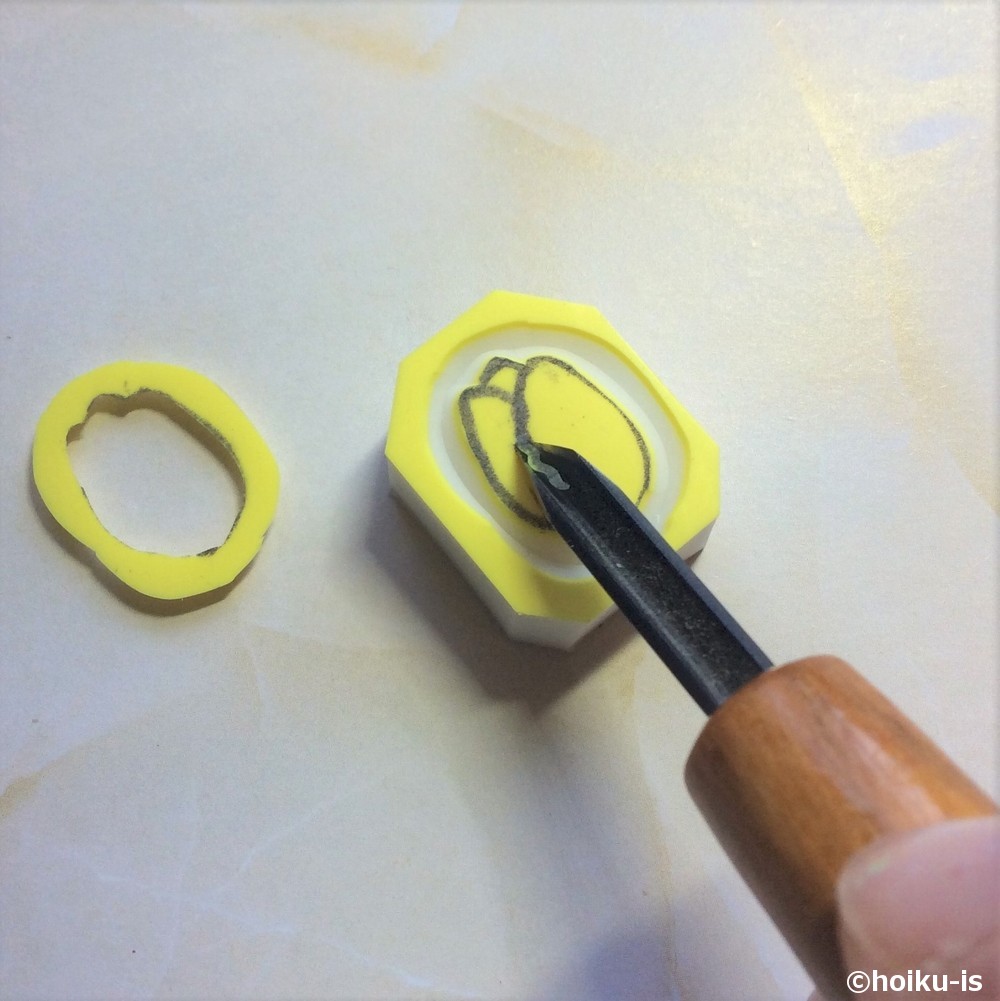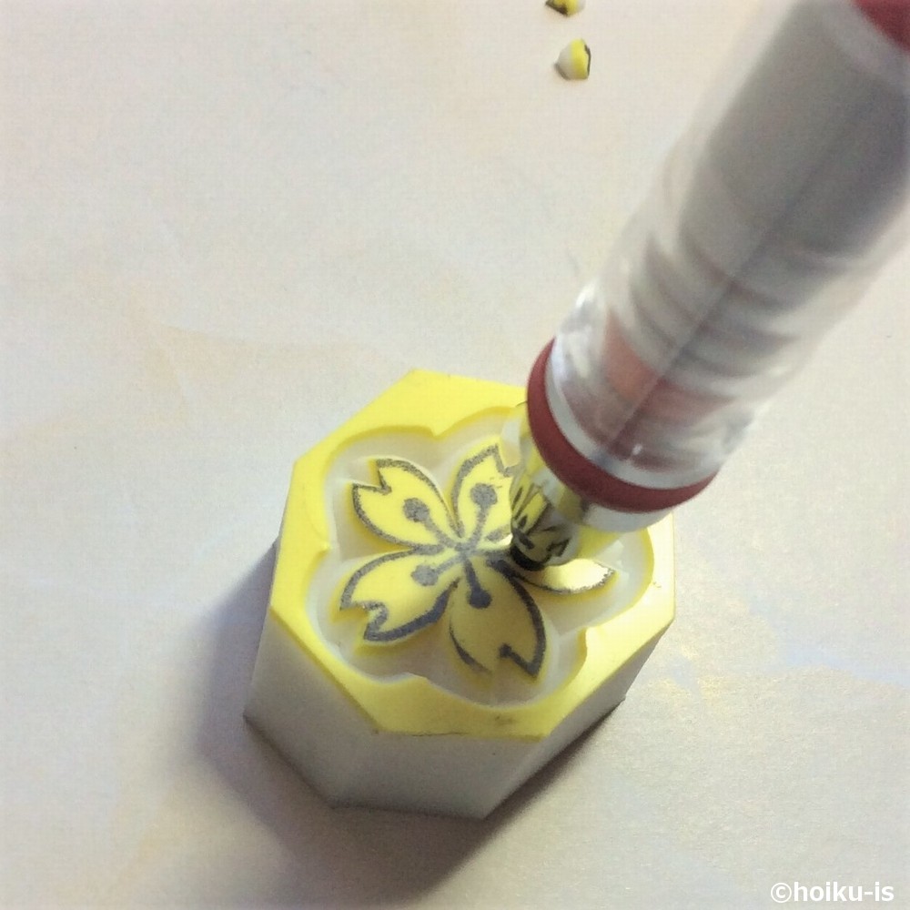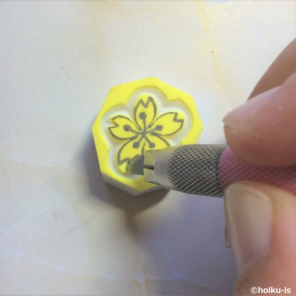 輪郭の彫り方はこれまで通りです。ちょっとしたポイントですが、桜は一枚ずつの花びらでナイフを抜き差しすると良いです。あと、花びらの先の部分は、後から彫る方が楽なので、下書きの線は無視して輪郭を掘りましょう。
