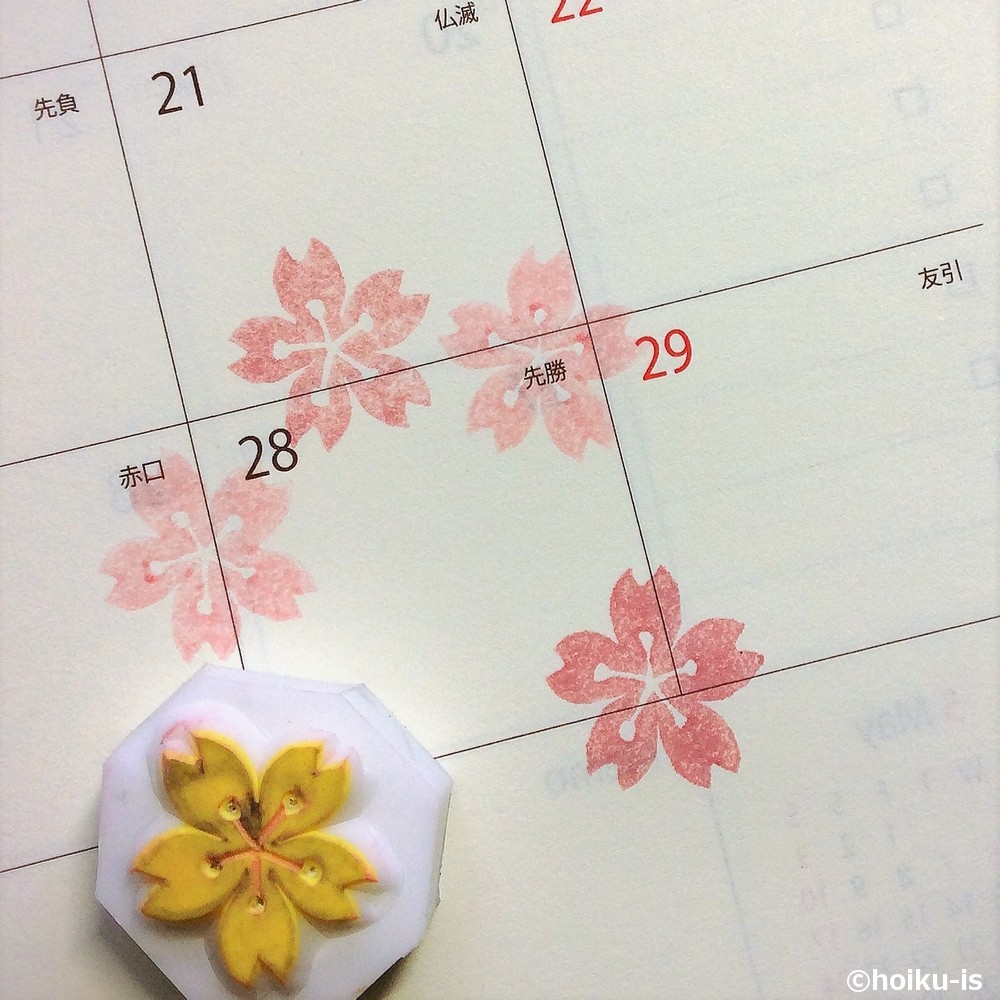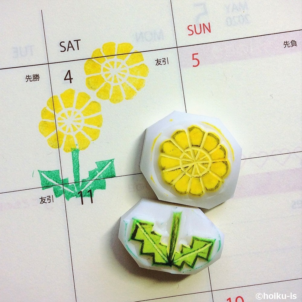 葉っぱも作ってみると組み合わせて楽しめると思います。押し方のイメージとして、手帳のカレンダー部分に押してみました。言葉とともにはんこを添えると、