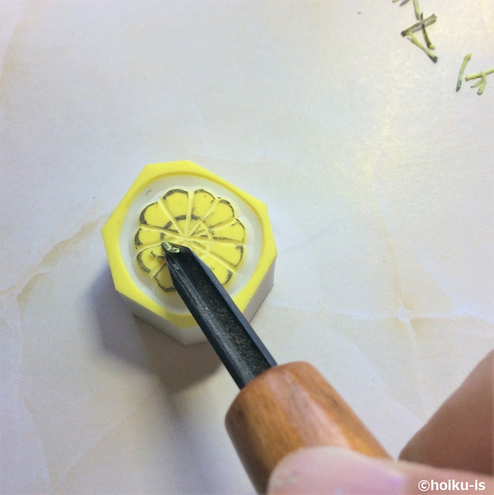 桜は、輪郭の時に残していた、「V」の部分を彫り、続いて真ん中のめしべの部分を彫ります。