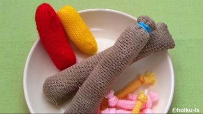 こちらは、ハギレで作ったしずく型の食材です。直径4㎝ほどあるので、2~3歳頃から遊べます。