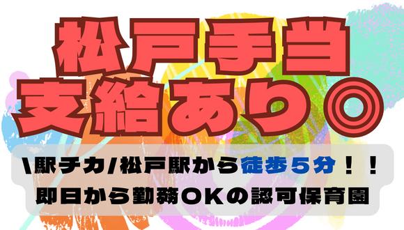 保育士/派遣のお仕事♪/松戸駅最寄り/時給1500円以上/高時給☆/週4日~OK!/給食あり!/8:30~17:30の勤務/系列園で弊社のスタッフさん活躍中!