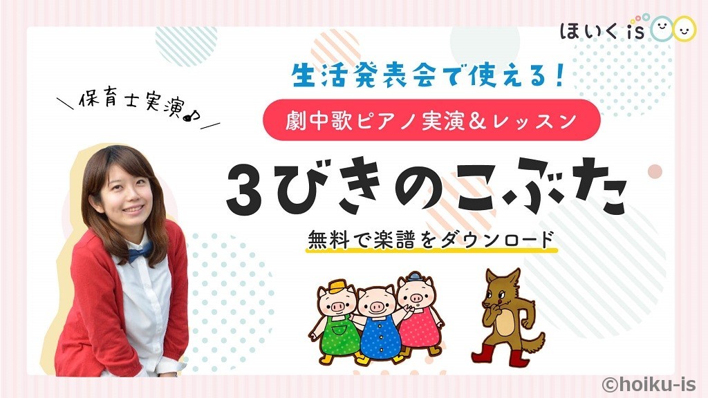 生活発表会は出し物をすることだけが目的ではなく、作り上げる過程を通して子どもたちの成長を促すことも大切な要素です。「3びきのこぶた」のお話には、危機を乗り越えるためにどうやって知恵を絞っていくのか? という問題提起の要素があります。作り上げていく段階では、ぜひ子どもたちと一緒にそういったテーマについても話し合いながら進めて行くことをおすすめします。子どもたちなりの意見が反映された、そのクラスだけのオペレッタを目指して取り組んでみてくださいね。